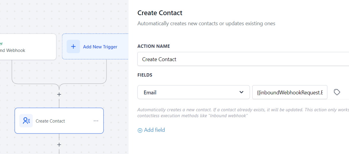 Click "Add field" button, choose Fields "Email", and click the little icon, in the popupwindow, choose {{inboundWebhookRequest.Email}}