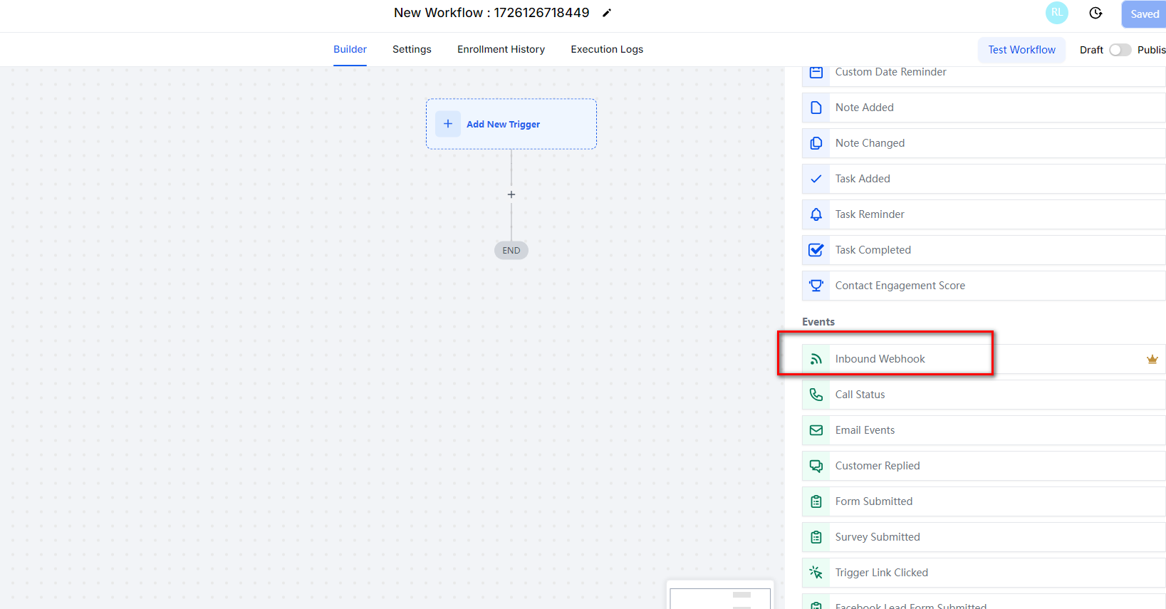 On the new workflow window, click “Add New Trigger”, find “Inbound Webhook” event from Events list